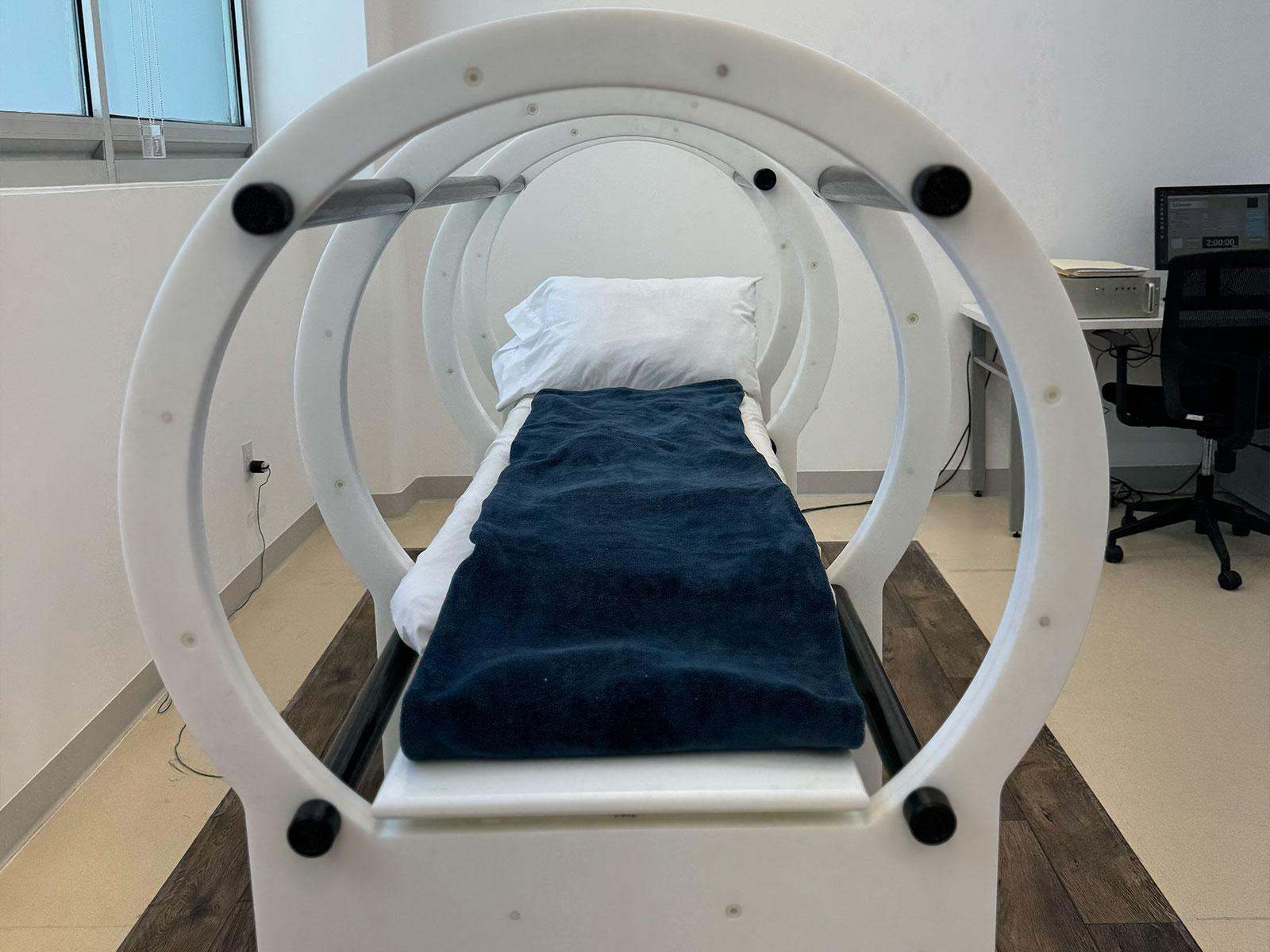The patient lies comfortably in the treatment device on a supported mattress and is surrounded by 4 circular coils which administer a low level pulsed electrical field